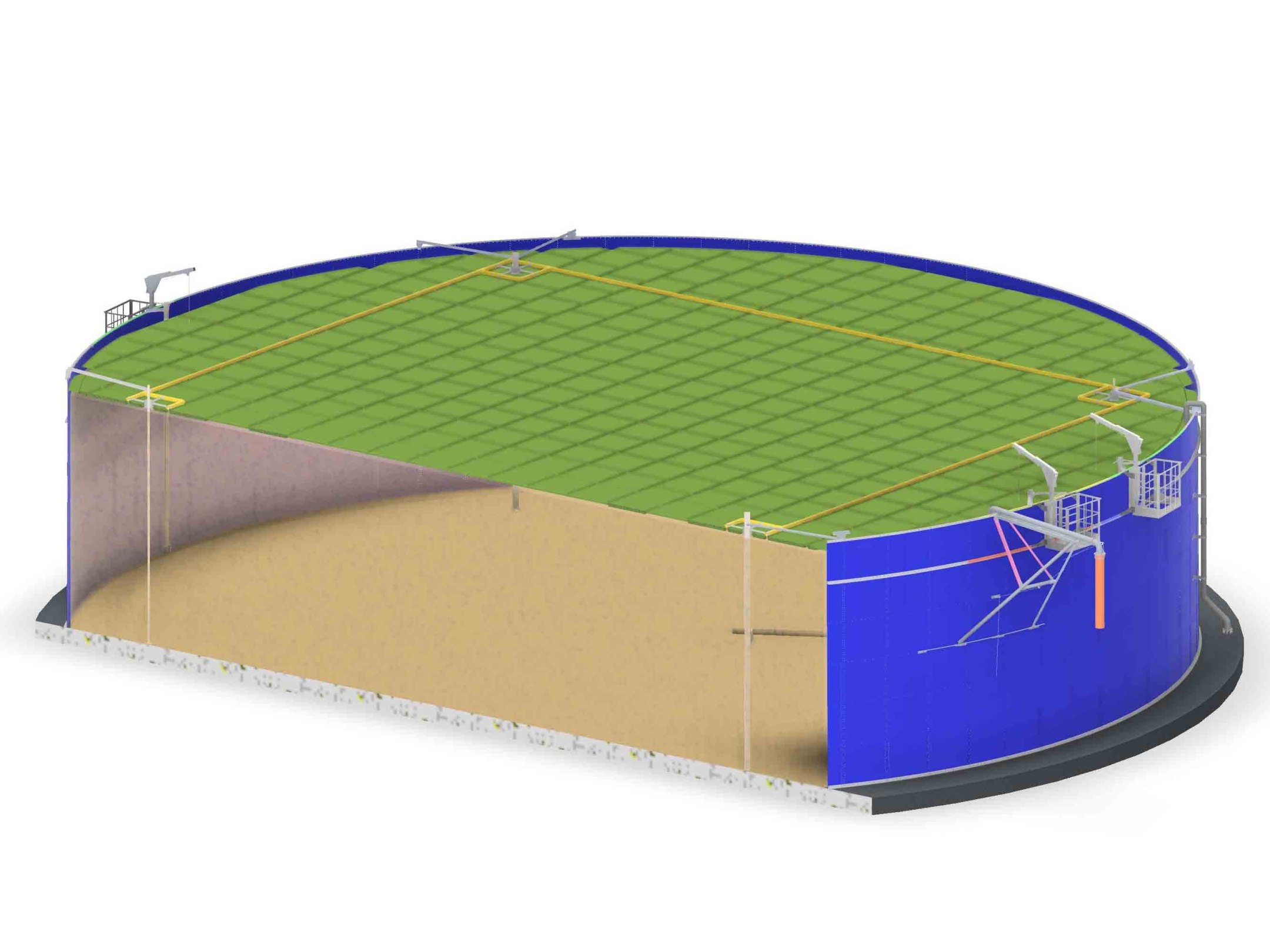 В проект включены технологические трубопроводы, каркасная опорная кровля с теплоизоляцией. Расчет опорных ферм для труб подачи, прочностные расчеты резервуара.