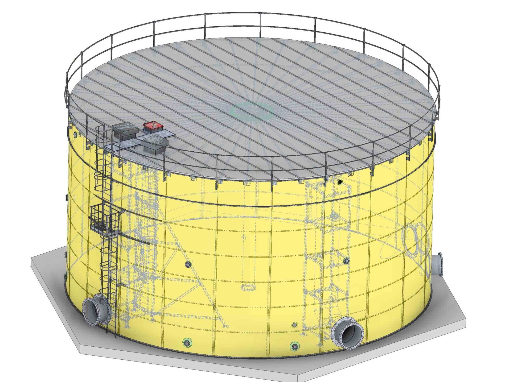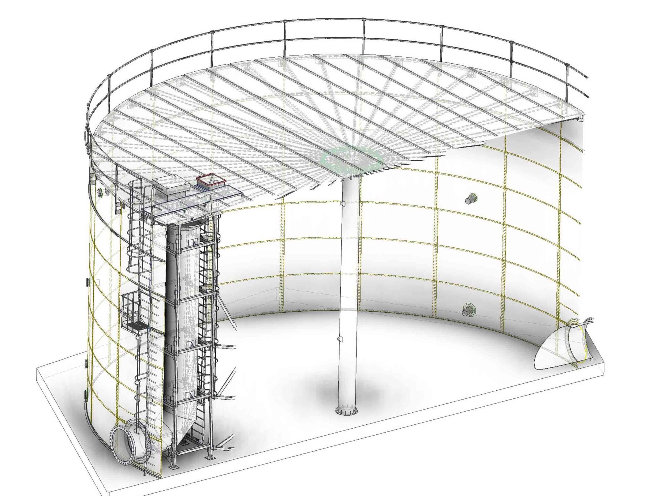 В проект включены технологические трубопроводы, балочная кровля с теплоизоляцией. Прочностные расчеты резервуара.