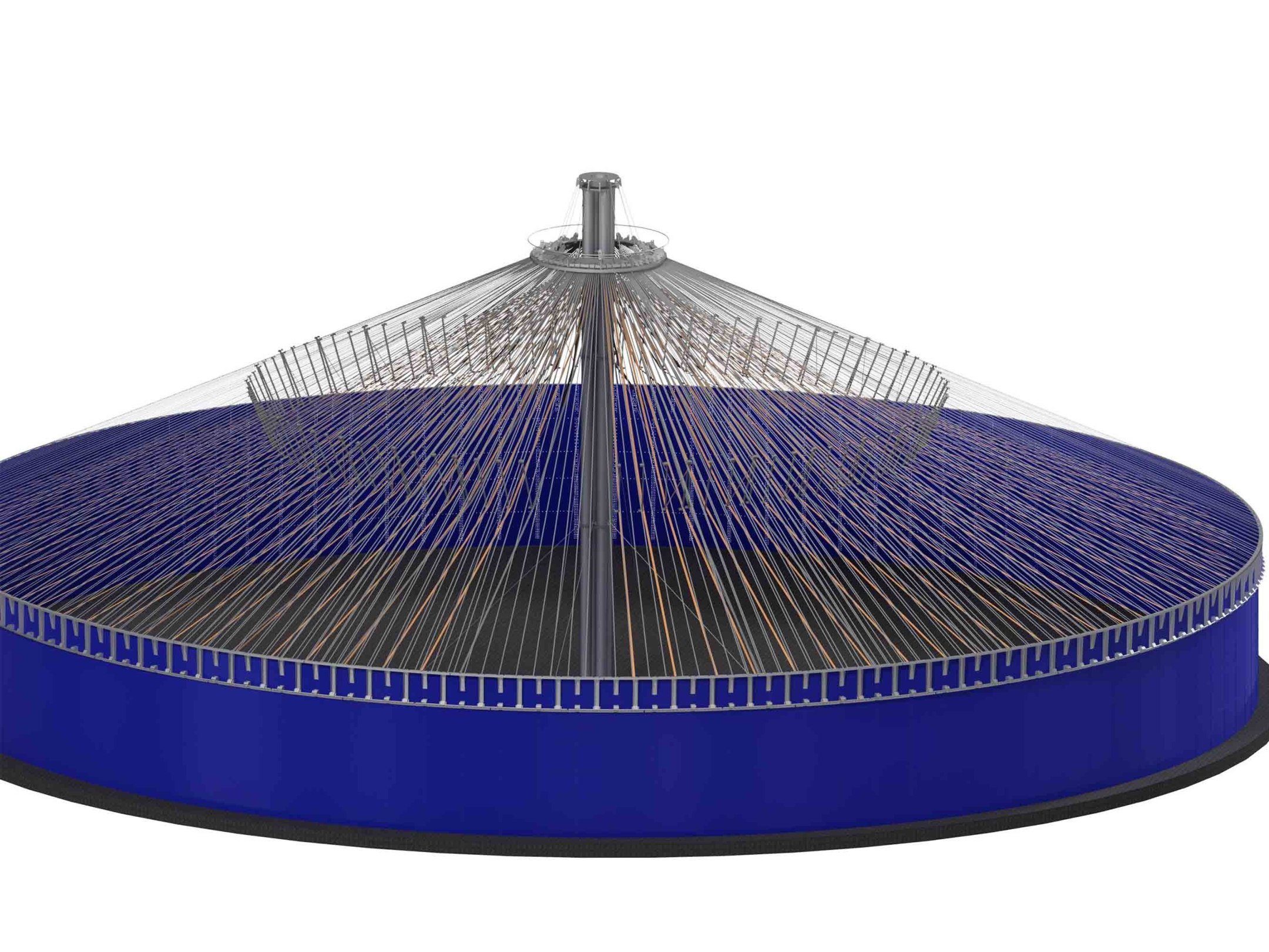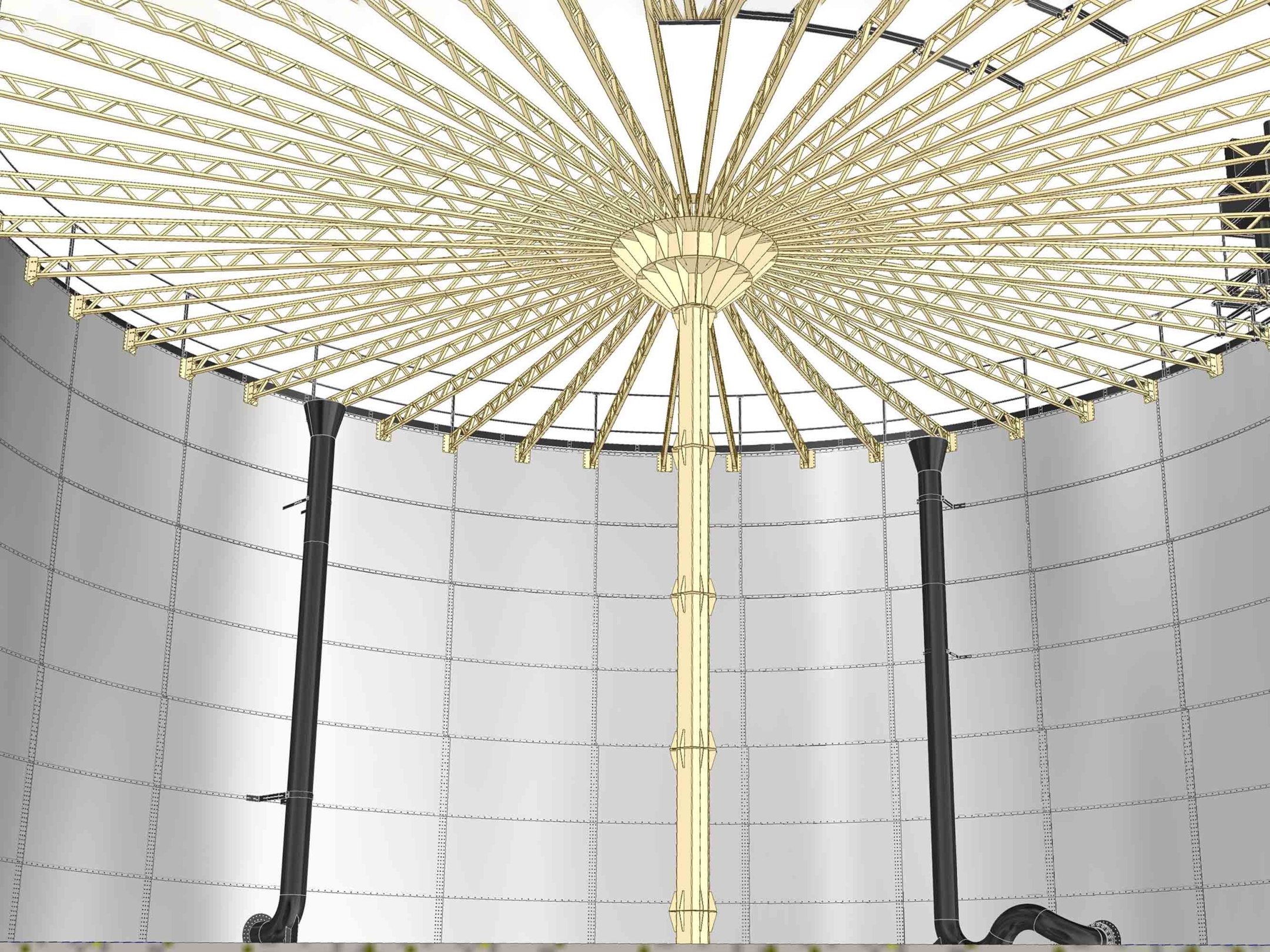В проект включены технологические трубопроводы, каркасная опорная кровля с теплоизоляцией. Расчет опорных ферм для труб подачи, прочностные расчеты резервуара.