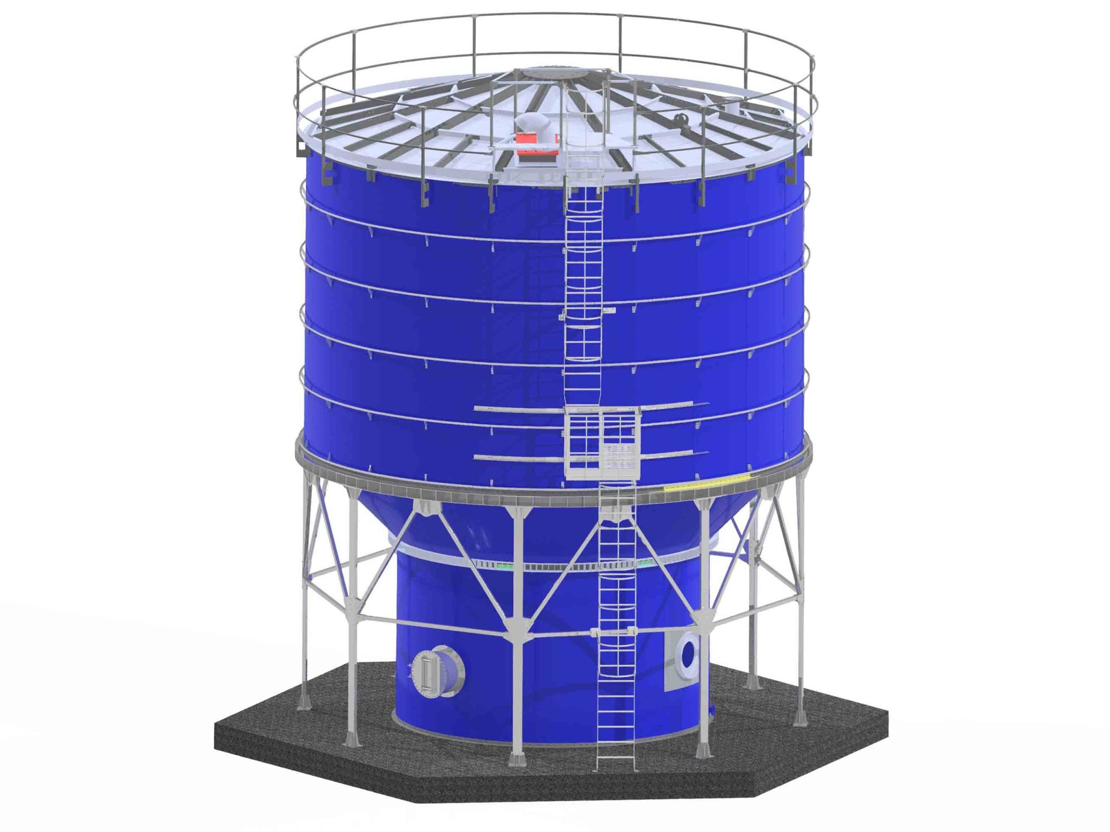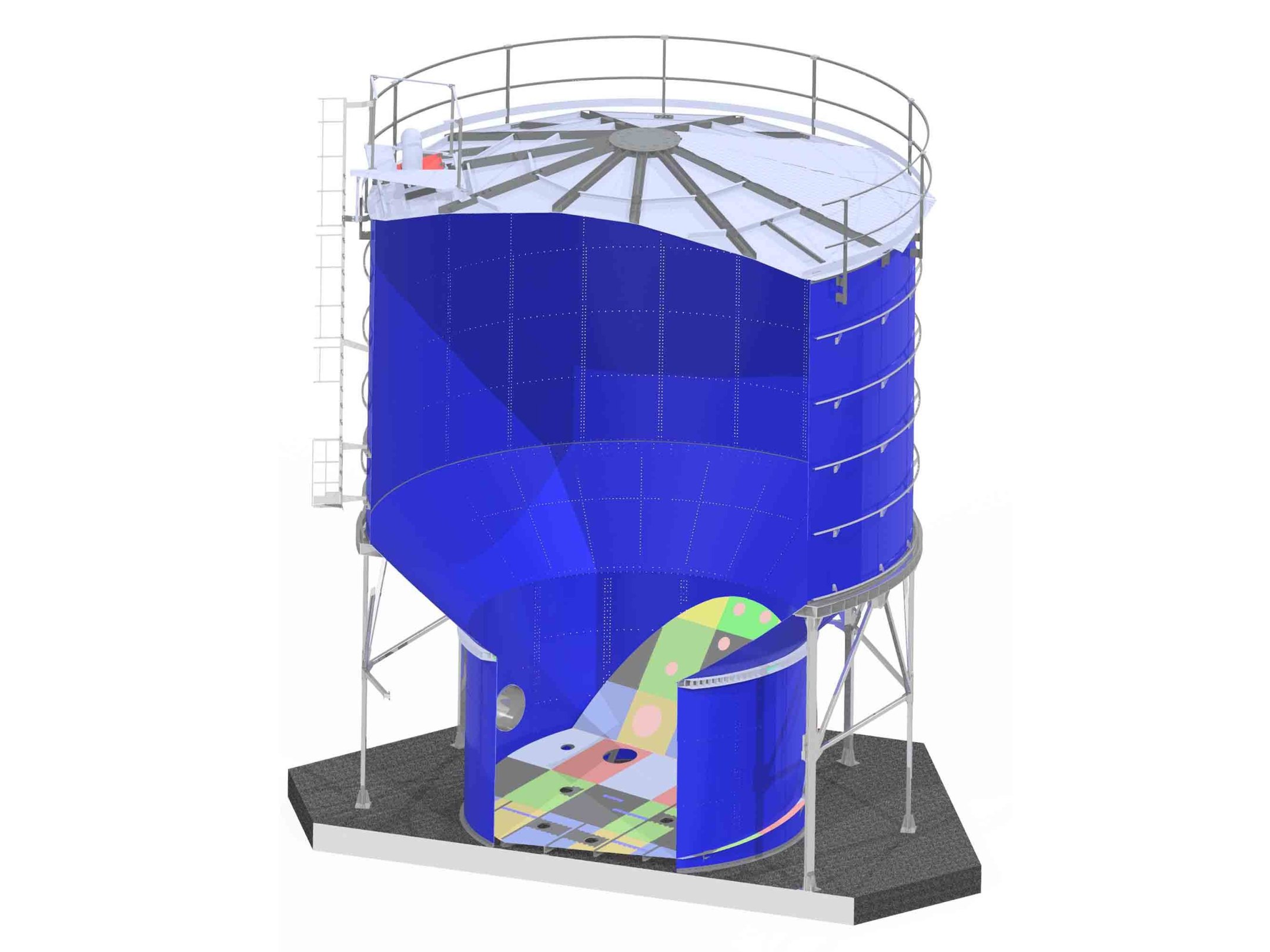 В проект включены наклонное сболченное дно, коническая каркасная кровля с теплоизоляцией.